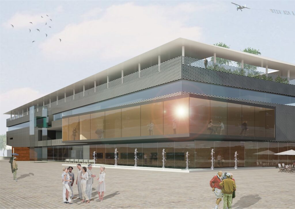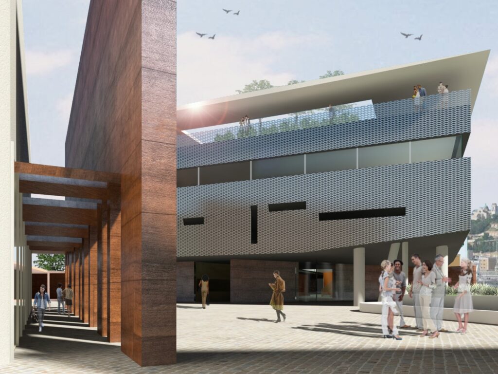 Tre volumi si raccolgono attorno a una piazza, evocando la geometria della memoria e offrendo spazi aperti, permeabili, condivisi. La stazione marittima, cuore del progetto, è anche un luogo di incontro e di attraversamento: biglietterie e servizi essenziali si affiancano a spazi espositivi, un ristorante panoramico, una ludoteca, un albergo flessibile pensato per viaggiatori e cittadini. I materiali dialogano con il contesto: cemento, vetro, arenaria. Le funzioni si integrano in una nuova sequenza urbana, dove la soglia tra porto e città si fa piazza.